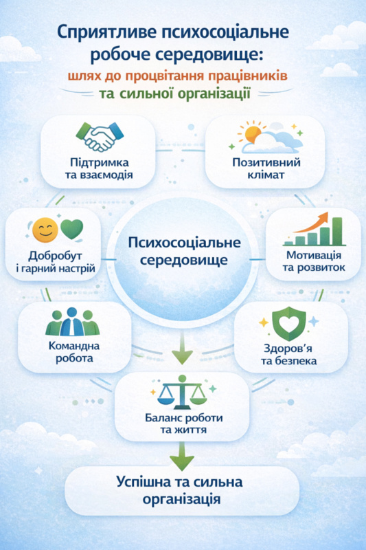 Міжнародна організація праці (МОП) наголошує, що психосоціальні фактори — стиль управління, організація робочого часу, взаємодія в колективі — впливають на фізичне здоров'я працівника, його продуктивність та безпеку. В умовах криз та швидких змін сприятливе середовище стає основою стійкості бізнесу.